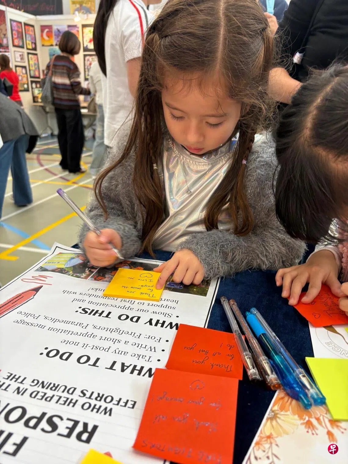 新加坡国际学校(香港)的四名中四女生刘泳廷、蒋恩萱、薛梓蔚和罗慧彰,除了捐出零花钱给救灾基金外,也动员全校师生和家长,为香港警方、消防员和医护人员书写了230封感谢信,分粘到六个致谢板上,送交至前线人员。