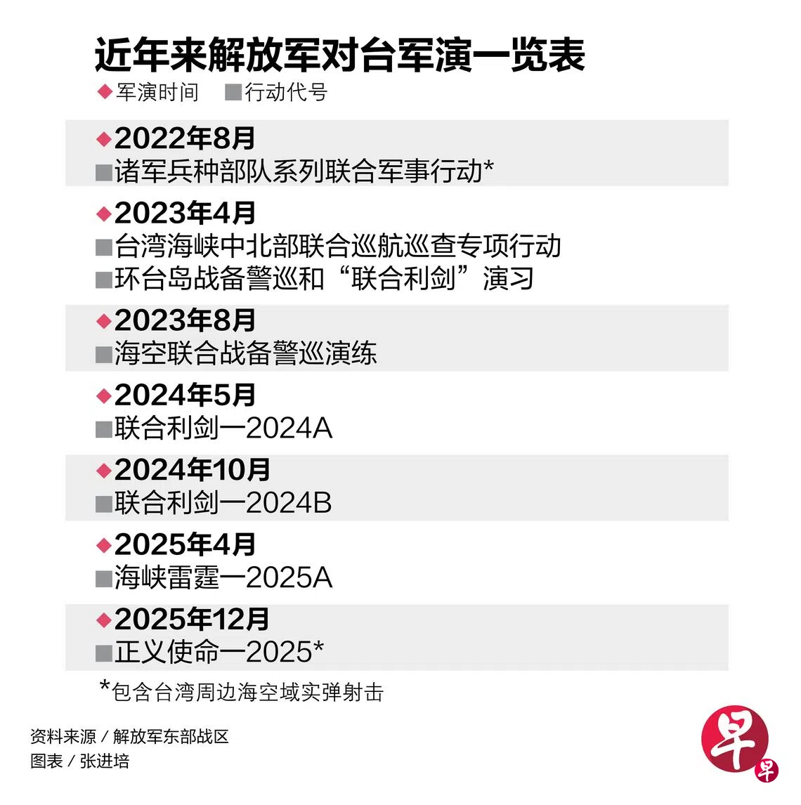 解放军东部战区星期一(12月29日)组织陆军、海军、空军、火箭军四大军种兵力,在五个环绕台湾演训区展开“正义使命—2025”演习。