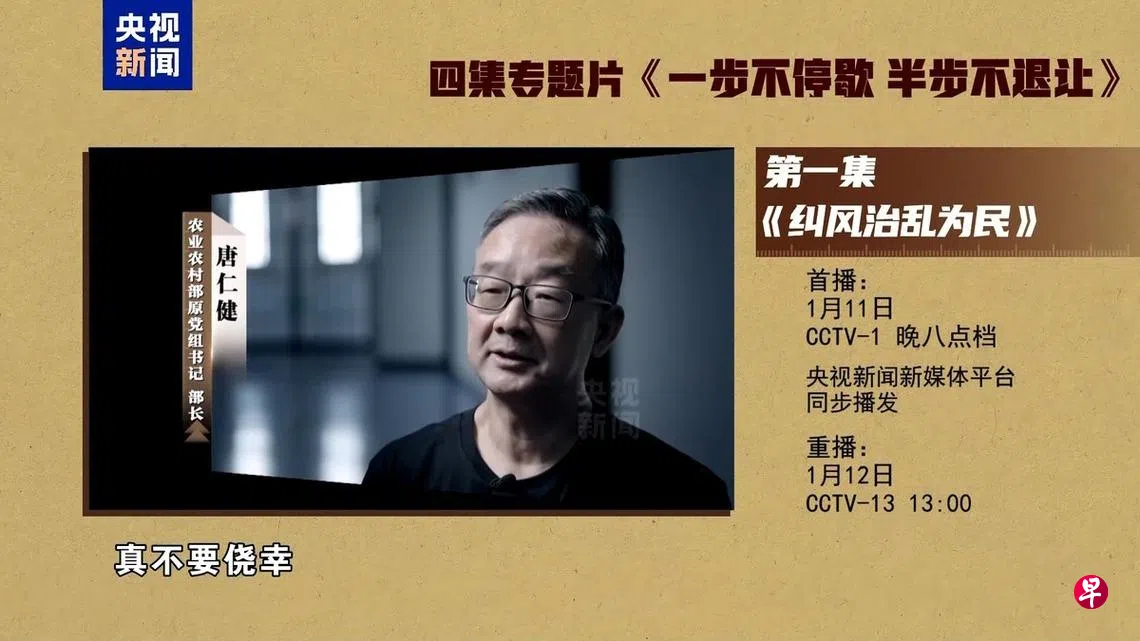 中国央视播出的反腐专题片《一步不停歇 半步不退让》共四集,全片选取12个案例,重点聚焦官商勾结的腐败行为。其中,一审被判处死缓的唐仁健在第一集面对镜头流泪忏悔。