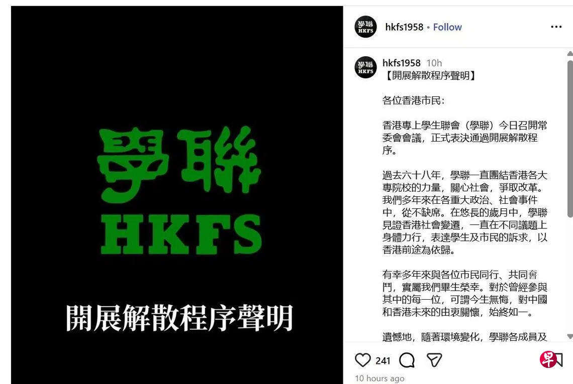 他说:“《香港国安法》2020年实施后,多个反对派政团先后解散。近年香港大学生已不热衷参与政治活动,也没人捐钱给学联,它解散并不令人感到意外。”