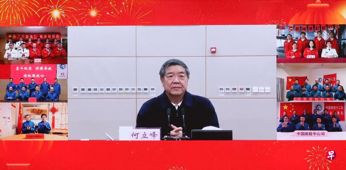 据中新社报道,何立峰星期一(2月9日)在北京通过卫星视频连线,向中国正在南北极执行任务的科学考察队员们致以慰问和新春祝福。
