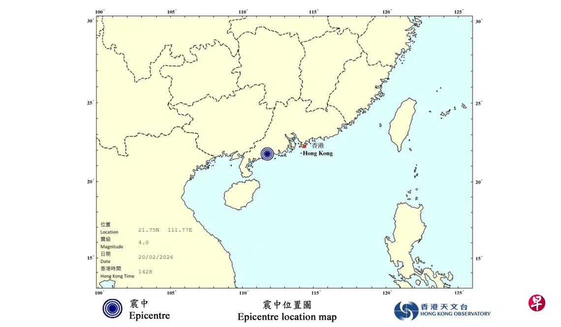 广东阳江市阳西县星期五(2月20日)下午发生4.0级地震,广东多地网民表示有明显震感。香港天文台接获超过100名市民报告,表示地震持续数秒。