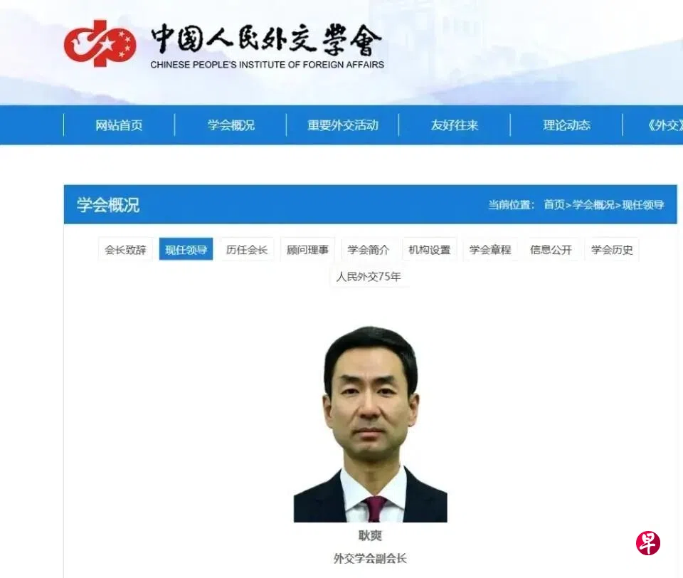 中国人民外交学会官网更新“现任领导”栏目,显示今年53岁的耿爽出任上述新职。