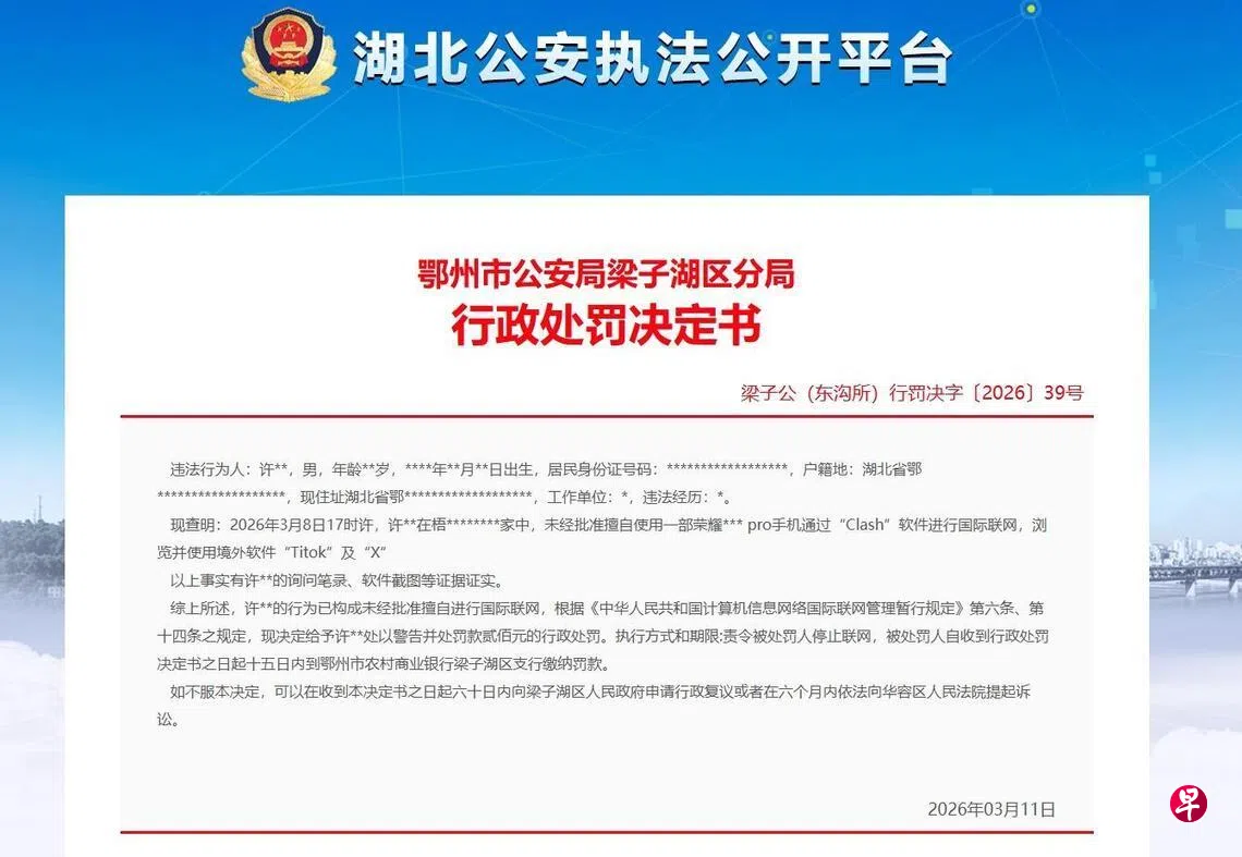 文书详情显示,3月8日下午5时许,鄂州一名许姓男子在家中未经批准擅自使用一部荣耀手机,通过“Clash”软件进行国际联网,浏览并使用境外软件“Titok”(应为“TikTok”)及“X”(前称推特)。“ 以上事实有许某某的询问笔录、软件截图等证据证实。”