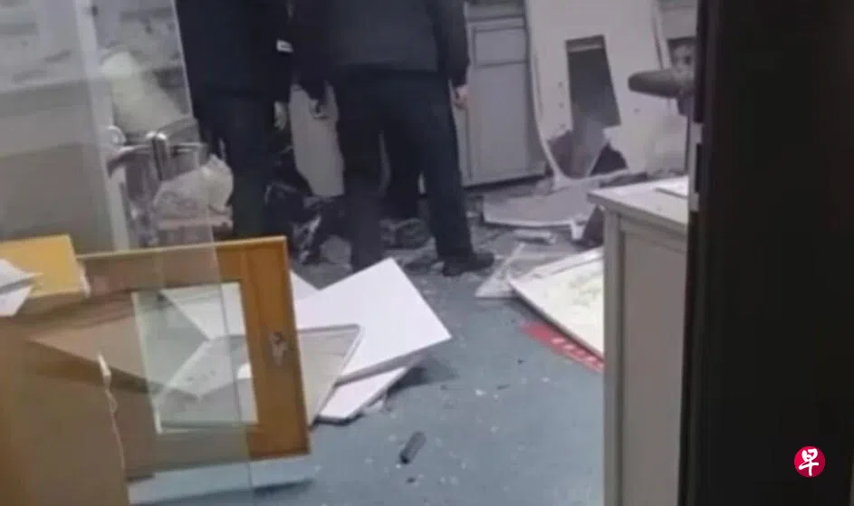 现场图片显示,有消防员与救护车赶到现场,实验室门口有血迹,室内设备出现明显破损、碎裂痕迹。