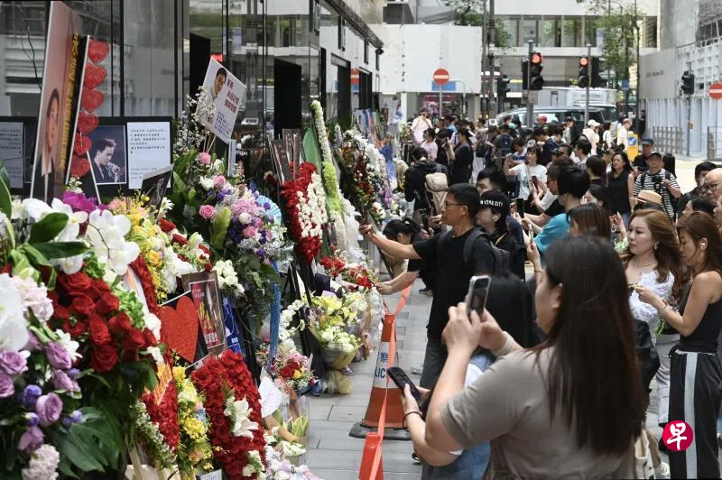 有传媒同行在朋友圈发了一些现场采访的视频。画面显示,文华东方酒店外行人路堆满不同的鲜花、花牌和纪念展板,将酒店外墙化成花海。现场的卡片则写满“永远宠爱”“继续宠爱”等字句,场面既温馨感人又壮观。