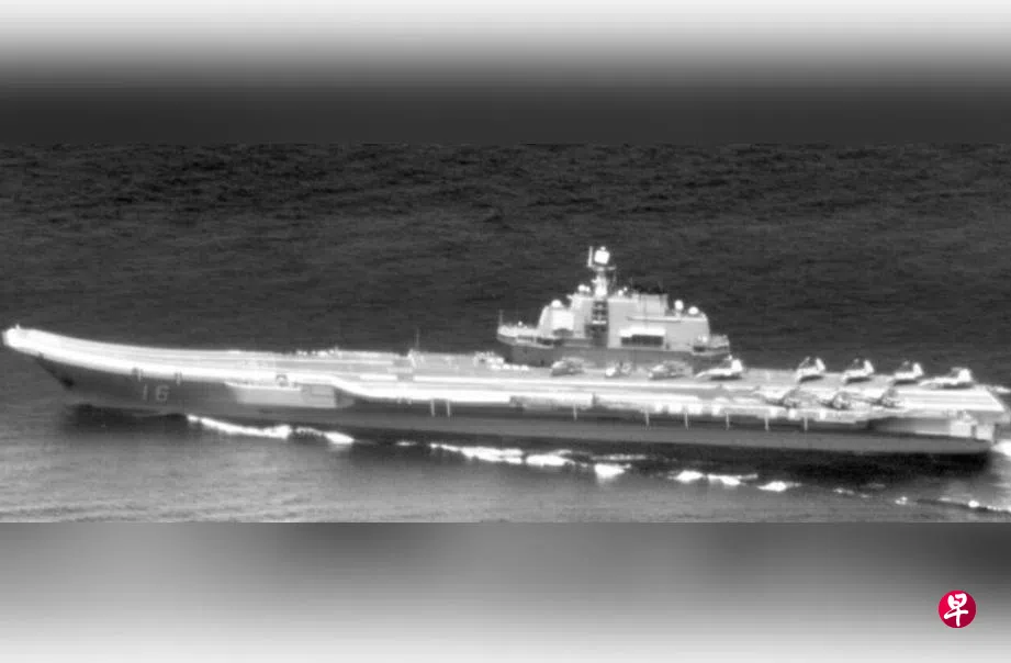 台国防部也公布台军监控辽宁舰的空照画面。这张黑白照片显示,辽宁舰的甲板上有八架歼15战斗机与3架直升机。