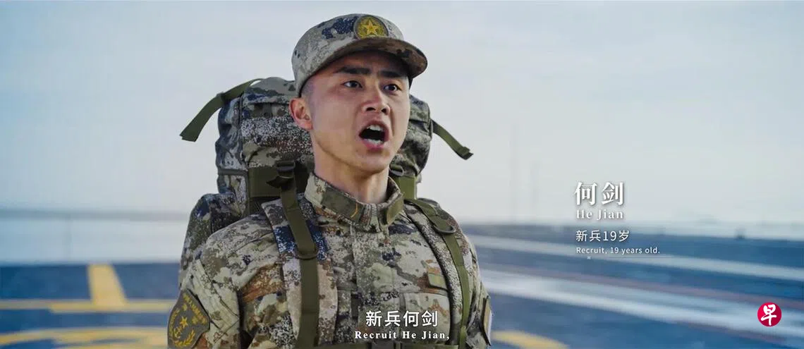 片中人物名字分别是廖宁、单东、付建,隐喻中国现役三艘航母的名字——辽宁舰、山东舰、福建舰。福建舰上有名19岁新兵报到,他的名字叫何剑。