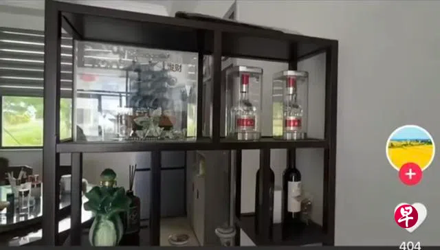 画面里,两名社区工作人员走到一户装修颇为精致的老人家中,柜子上摆放着五粮液,院子还设置了景观鱼池等。