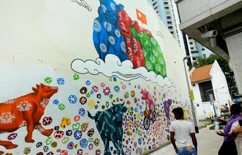 印度人和牛的关系密切,印度宗教中的神牛崇拜更是历史悠久。小印度曾经是一个牛只买卖交易的地方。在2015年的首届“小印度艺术之旅”中,画家林慧敏(Eunice Lim)的一幅色彩艳丽,吸引眼球的壁画“牛之地”(Cattleland)出现在小印度的巴弗罗路上。这一回,林慧敏在新作中再现《牛之地》,她的巨型壁画《牛之地2》就位于小印度地铁站E出口(67 Kerbau Road)。