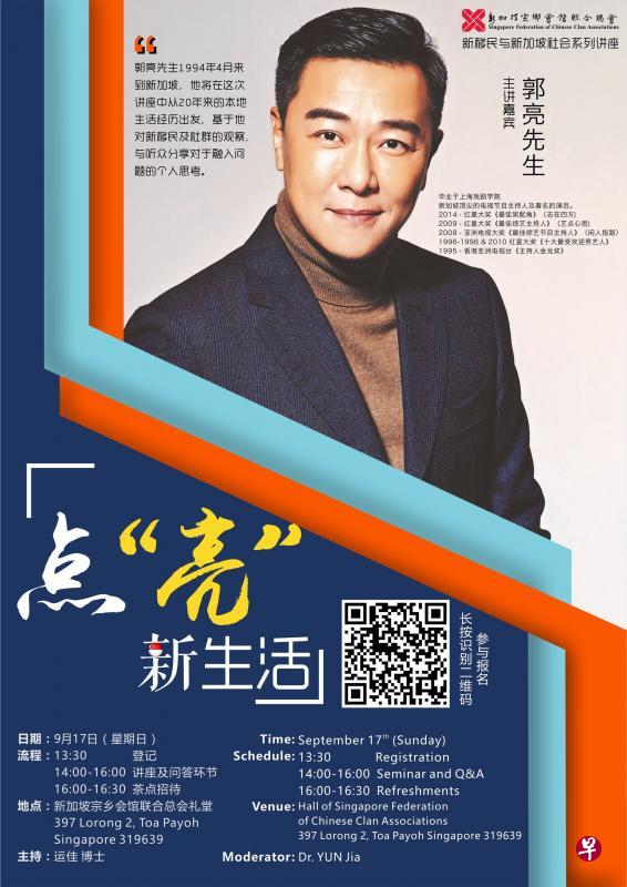 新加坡宗乡会馆联合总会本星期日举办新移民与新加坡社会系列讲座之“点‘亮’新生活”。本次讲座主讲人为艺人郭亮,他将以亲身体验分享他扎根狮城的故事。