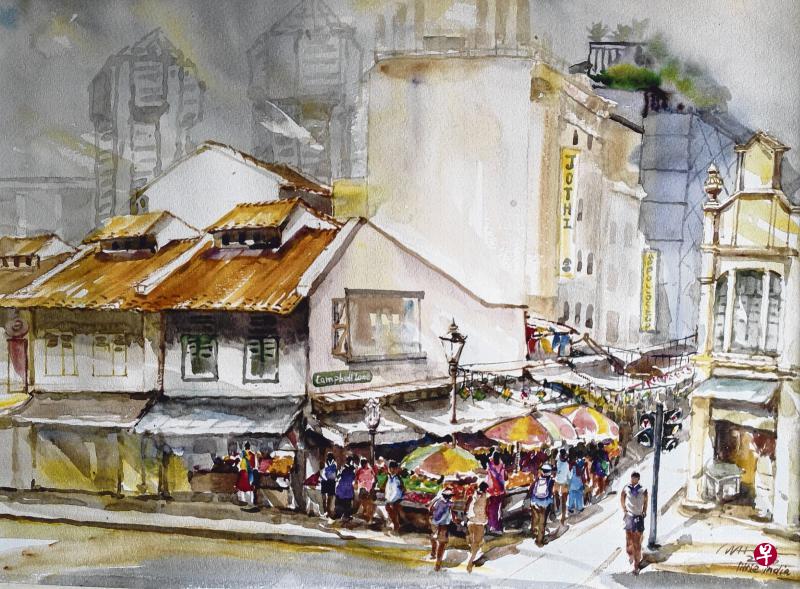 这幅小印度街景, 是近期写生的作品, 描绘甘贝尔巷(Compbell Lane)巷口的水果蔬菜摊。这里的店屋保留着早期旧式建筑的结构格式,原本通车的小巷如今已成步行街,游人熙熙攘攘,一派热闹繁忙景象。