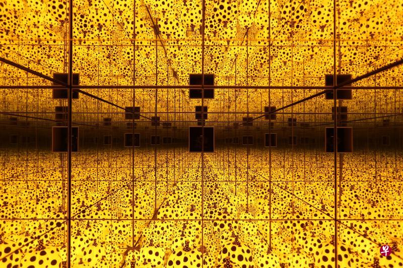 1991年开始出现的南瓜镜室,类似一个经典简约的方块,四面为光闪闪的1平方米四方镜子,整个空间为不同形状的黄色和黑色波点笼罩。方块其中一面开个小窗口,令人窥视到里头一组手工制作,也是黑黄波点的南瓜雕塑,为一组镜子笼罩映照,感觉南瓜扩大至无边无际。在新加坡国家美术馆呈献的2015年版本南瓜镜室取名《南瓜精神落入天堂》。