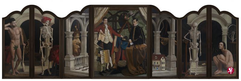 在资本主义和全球化的今天,纳堤重新演绎亚当和夏娃的故事,并加入两名权威男性,为西方不同阶段艺术史的物品包围。作品有当代意象符号,一个是夏娃的纺车,还有娱乐贵族的矮人。油画的整体组合相当神秘,探索西方祭坛艺术的演变。纳堤试图创作出超越西方基督教祭坛的艺术品,欢迎访客解读。