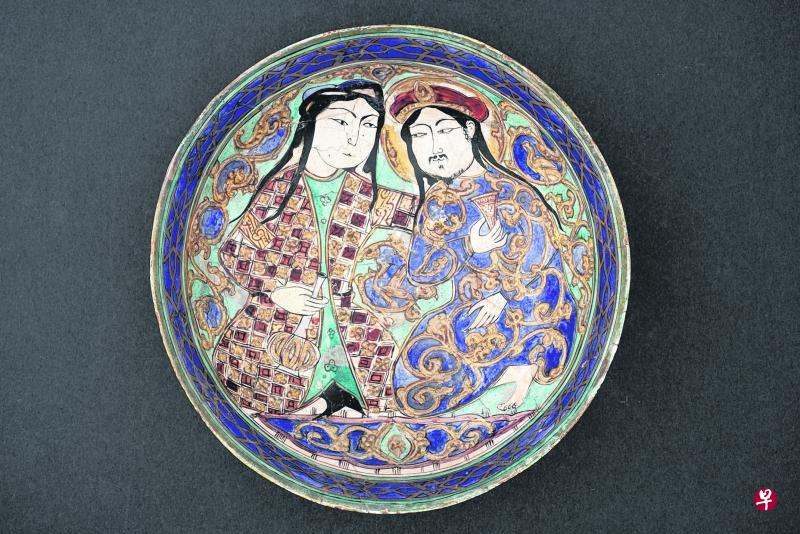 眼前这个陶碗来自波斯,碗上一对璧人凤眼小口,下巴圆润,脸颊饱满,似乎和中国唐代一样以胖为美。右边的男子身着卷草纹的蓝色长袍,一旁的女子则身披菱形花纹的棕色衣衫。他们是何许人也?