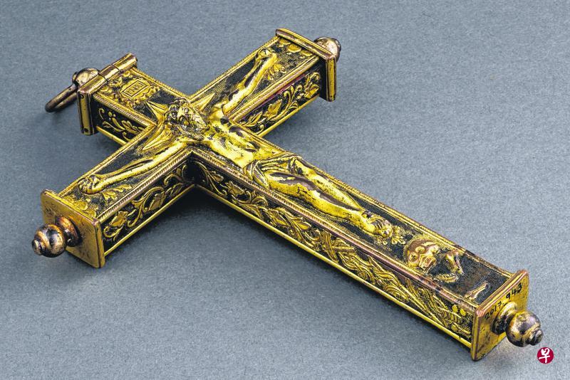 这是一个“机关重重”的十字架,表面以黑漆和镀金装饰,展现出黑与金的强烈对比,内里却另有乾坤,是一个小小的“机密”储物格。