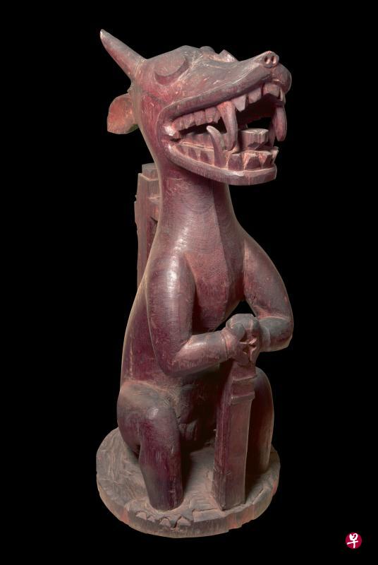 这两件用铁力木雕刻的作品出自马来西亚砂拉越,被婆罗洲当地土著达雅族视为神兽,命名为Aso。Aso外形为狗头野猪鼻,露出狰狞的獠牙。祂掌管地府,是阴间的冥王,人们的守护神,保护人们死后平安到达另一个世界。Aso同时也是生育之神和农业之神。