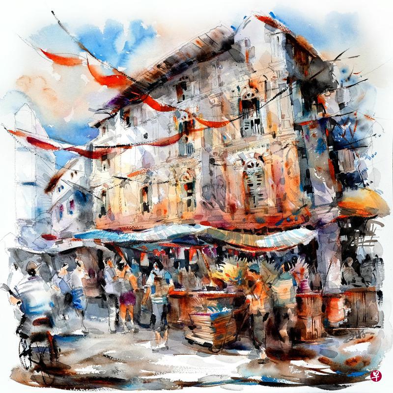 这幅丙烯画里,我尝试重现旧日牛车水的景象——战前的三层店屋群,狭窄昏暗的店前五脚基,人来人往的小巷,街头小贩喧闹的叫卖声,构成了一幅牛车水的历史风貌。