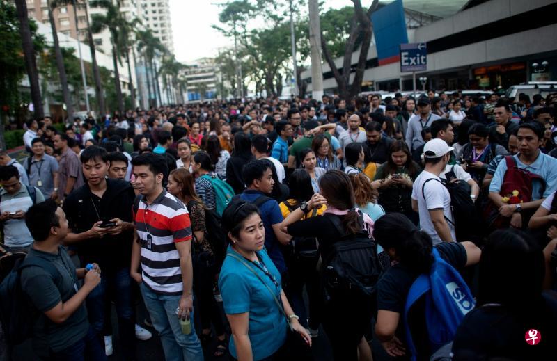 菲律宾北部吕宋岛昨天(4月22日)发生6.3级地震,已知两个小镇有五个人被坍塌的房屋压死。图为在震中以东的首都马尼拉也有强烈震感,市民纷纷逃到户外。