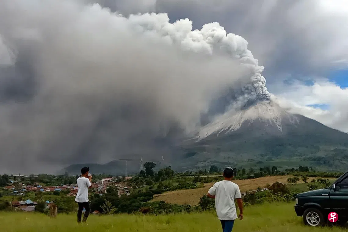 根据地质局,锡纳朋火山(Mount Sinabung)喷发时间长达12分钟。不过,火山灰没有飘至附近村庄或影响客机飞行,当局也没有发出疏散令,只是劝请民众远离火山方圆5公里地区。图为北苏门答腊省卡罗县(Karo)的民众望向正冒出巨大灰云的火山。