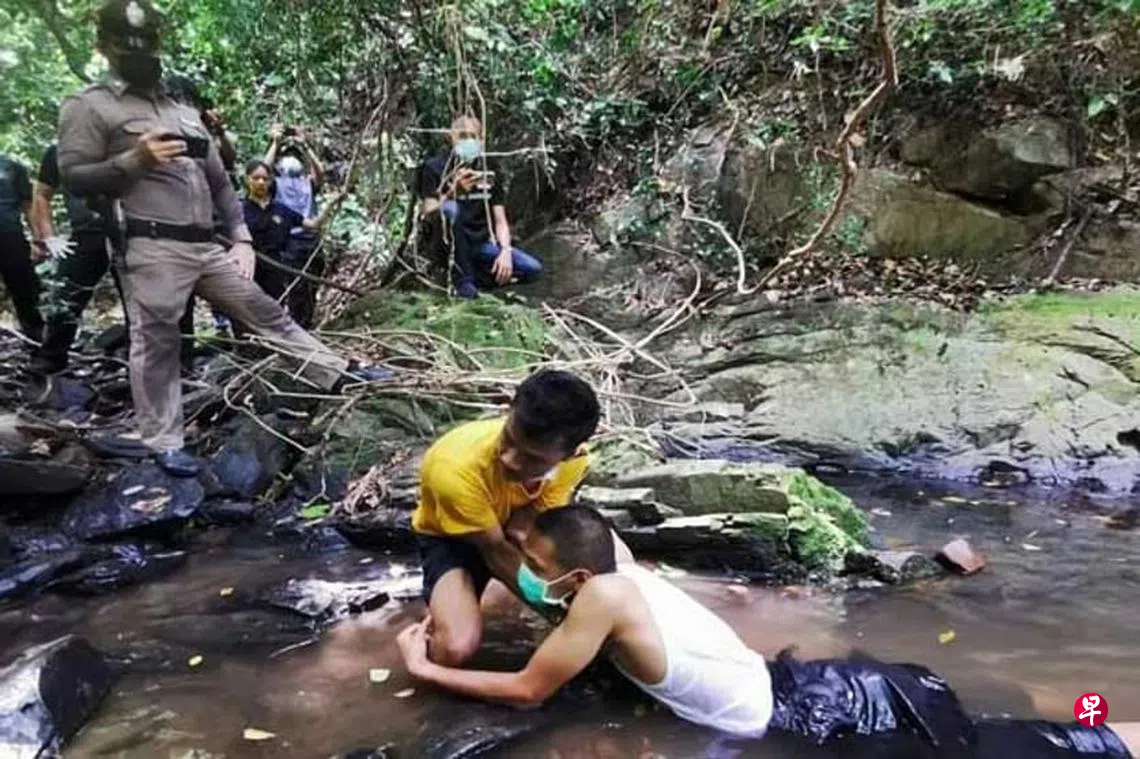 警方副发言人吉沙那说,由于验尸报告仍未出炉,死因不明。据泰国媒体早前报道,警方检查周边地区的监视器后,发现一名可疑男子,而且身上有抓痕,因此进行了严格审查,最终男子承认作案。嫌犯失业,他指当时想强奸死者,却遭顽抗,便将她掐住按入水中直至溺毙,随后弃尸逃逸。泰国政府希望通过沙盒计划来振兴当地旅游业,但此命案将使该计划蒙上阴影。图为嫌犯(右二)在命案现场搬演作案过程。(曼谷邮报)
