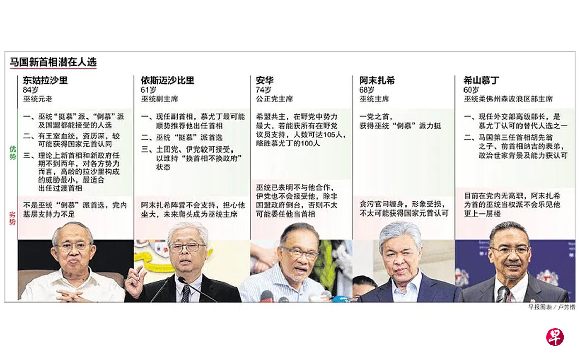 在野的人民公正党主席安华也在摩拳擦掌,而极力把慕尤丁拉下马的巫统主席阿末扎希已是司马昭之心,只是贪腐官司缠身的他出线概率不大。巫统的外交部高级部长希山慕丁被视为黑马,但若要达到安抚巫统“倒慕”派的目的,希山不会是最好的人选。