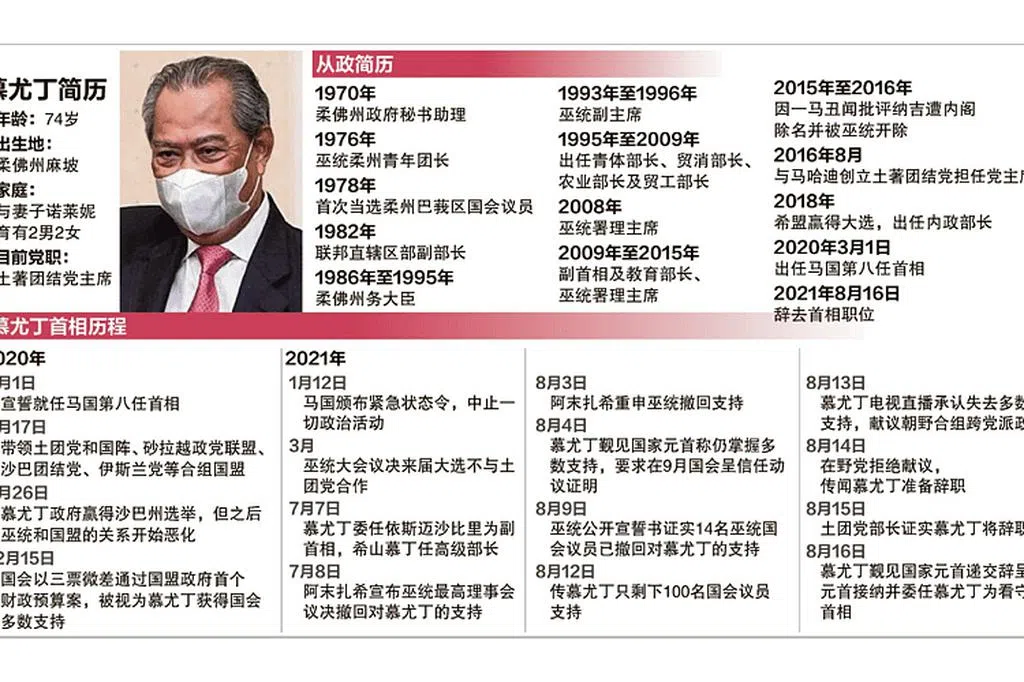 慕尤丁昨天上午举行最后一次内阁会议后,前往国家王宫向元首请辞,接着在下午发表电视演说。他说,他已经失去国会下议院大多数议员支持,因此决定按联邦宪法规定向元首请辞及内阁总辞。