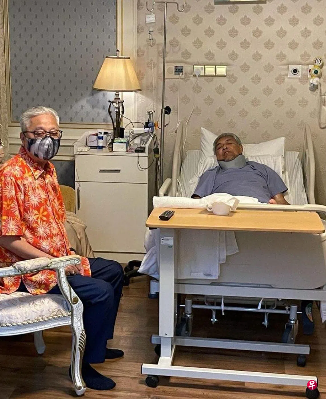 巫统主席阿末扎希原定前天出庭继续面对贪污与失信案的审讯,不过他出庭前跌伤了颈部,必须入院动手术。巫青团长当天在面簿贴图显示,阿末扎希入院后,首相及巫统副主席依斯迈沙比里随即前往探视。这是依斯迈沙比里上周六宣誓就任首相以来,首次与阿末扎希公开见面。吉隆坡高庭法官昨天传召阿末扎希的主治医生说明情况后,决定展延有关审讯至9月1日。(阿斯拉夫面簿照片)