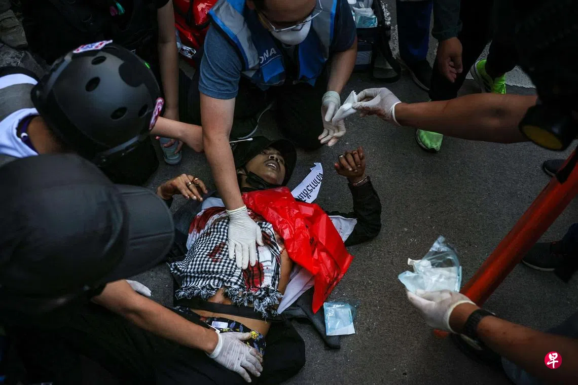 泰国首都曼谷昨日傍晚出现大批年轻示威者走上街头示威,抗议宪法法院上周裁定三名学运领袖要求改革王室诉求具有推翻君主立宪制的意图。他们高喊“我们并非要推翻这个国家、我们推动改革是要让这个国家变得更好。”泰国学生2020年7月开始上街示威集会,要求首相巴育下台、修宪改革王室及限制王室权力。图为一名示威者与镇暴警察发生冲突后受伤。(法新社)