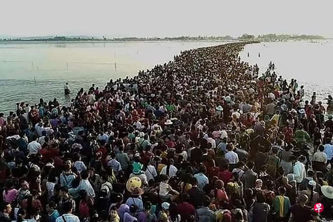 缅甸东南部孟邦大批佛教徒昨日清晨试图步行穿过浅水区,前往距离海岸约3公里岩石上的一座佛塔参加庆典,不料一行人在穿越一条被水淹没的堤道时跌入海中,至少15人溺毙。当地官员说,当时涨潮的水位太高,一些人在拥挤的堤道上被推挤,跌入海里被冲走。当局已打捞起15具尸体,仍有三人下落不明。这条堤道仅约四米宽,当地居民指堤道上的标记不清,因此险象环生。(法新社)