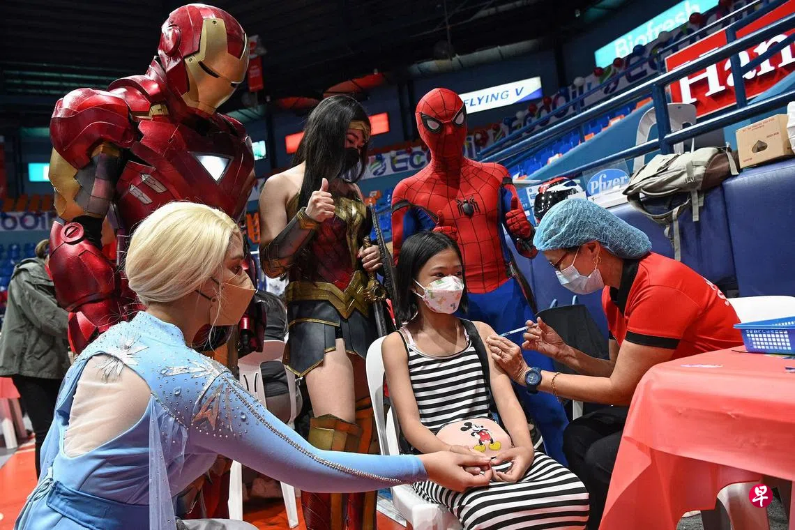 菲律宾为五岁至11岁儿童接种冠病疫苗计划昨日正式开跑,为了安抚儿童的紧张情绪,当局在接种中心特地安排了嘉年华活动包括打扮成钢铁人、神奇女飞侠及蜘蛛侠等超级英雄电影人物助阵,让儿童在欢乐的气氛中接种疫苗。菲律宾昨日新增6835起确诊病例及12起死亡病例,较上月15日单日病例激增至3万9004起显然有所放缓。自去年3月展开疫苗接种计划以来,在大约1亿1000万的人口中,有超过6000万人已完成疫苗接种。(法新社)