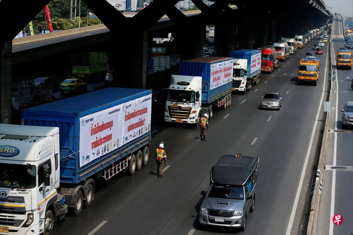 泰国曼谷至少50辆重型卡车周二在能源部附近一条公路慢驶,施压政府降低柴油价格,帮助卡车司机减轻燃油负担。由泰国陆路运输联合会组织的卡车上午9时30分开始出现在能源部附近,导致交通堵塞,直到下午4时才散去。