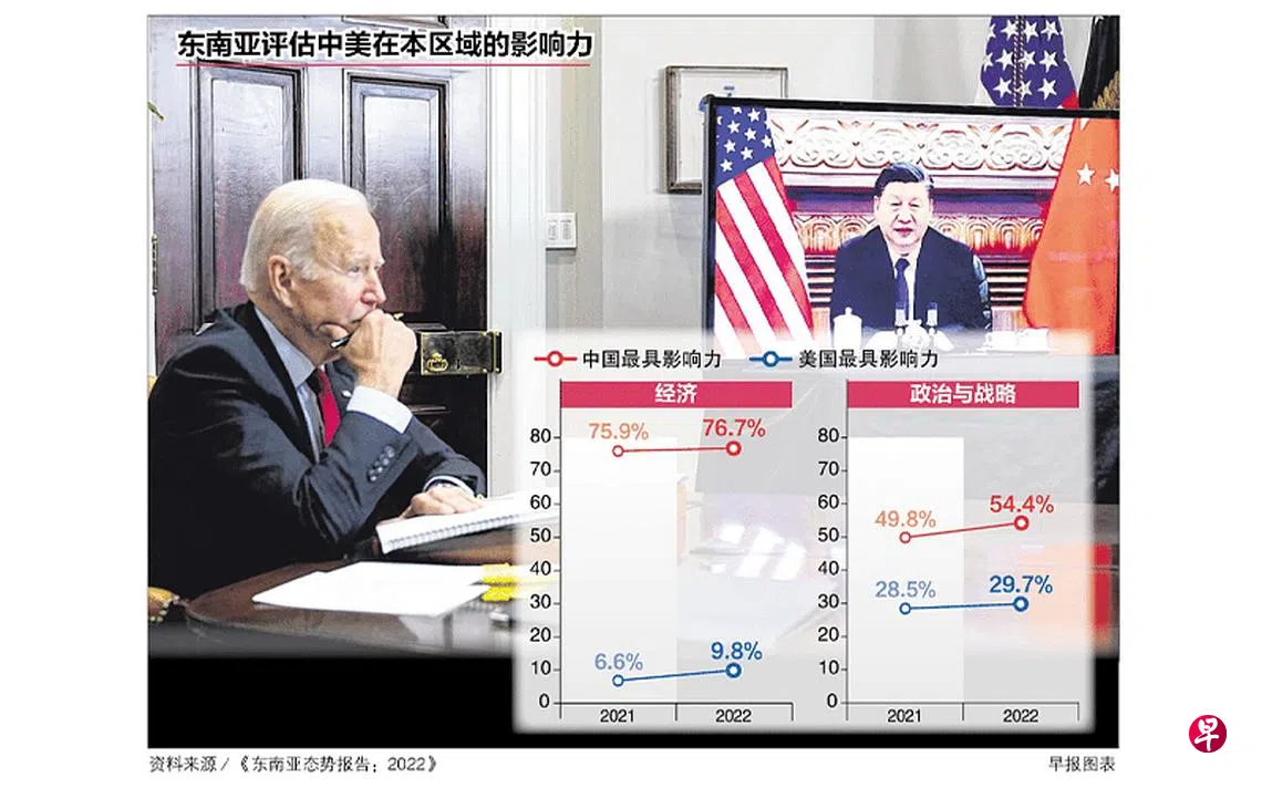 美国政府重新聚焦印度太平洋,提振了东南亚国家对美国领导力的信心。但在经济、政治和战略影响力方面,东南亚国家普遍认为中国在本区域更具影响力。