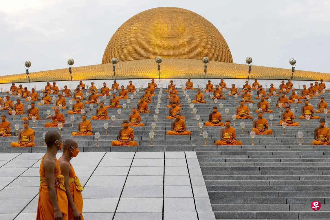 泰国首都曼谷北部巴吞他尼府的著名佛寺法身寺,前天开始一年一度的万佛节大法会。泰国95%人口是佛教徒,万佛节因此也是全国的年度盛典。法身寺每年庆祝万佛节时,都有数万信众参与法会。由于去年疫情严重,万佛节大法改为线上直播,今年参与法会的僧侣则全都戴上口罩并保持社交距离,以符合政府的防疫规定。(法新社)