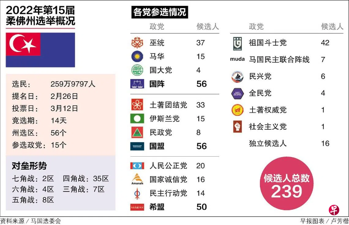 马来西亚柔佛州选举这次出现15个政党及239名候选人,是柔佛历来竞争最激烈的一次选举。分析员认为,激烈的选情导致马国政治版图更支离破碎,也造成各阵营除了与其他阵营竞争选民支持,阵营内部成员党也明争暗斗的竞争主导权。