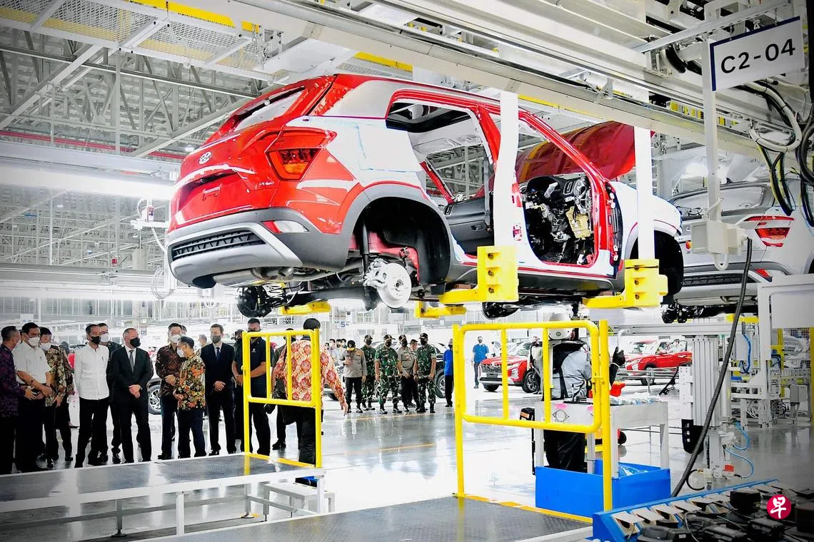 印尼总统佐科(左四)星期三到勿加泗市(Bekasi)出席现代汽车工厂的竣工仪式时说,政府提供了许多优惠,并取消了行政上的繁文缛节来推动电动车的发展。“我们必须在全球电动车供应链方面扮演重要角色。”