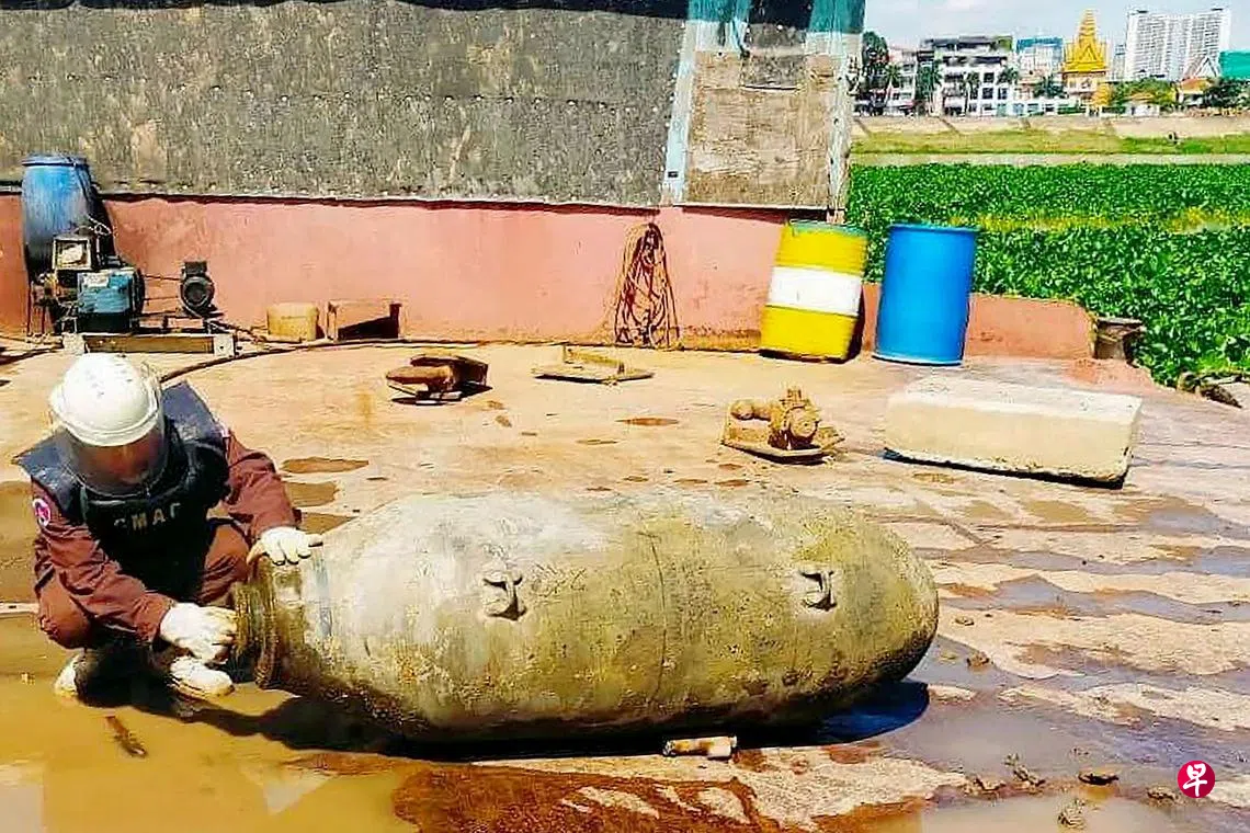 柬埔寨扫雷行动中心周四在首都金边王宫前的四面河发现重2000磅(约907公斤)的战争时期未引爆炸弹,之后安全清除。扫雷行动中心是在清理河床垃圾物时发现炸弹,该中心主任兴洛达说,这枚炸弹产自美国,是在战争时期美军飞机投下的,装载了500多公斤炸药,非常危险,“如果这枚炸弹爆炸,可能会对酒店、房屋甚至是王宫造成巨大破坏。柬埔寨非常幸运(逃过)”。