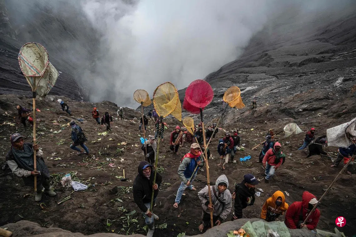 数以千计的印度教信徒周四攀登印度尼西亚爪哇岛东部的婆罗摩火山(Mount Bromo),举行已有数百年历史的宗教仪式。腾格尔部落的族人从婆罗摩火山周围的村庄登上这座活火山,将山羊、鸡、水果、鲜花和蔬菜等祭品扔进火山口,庆祝一年一度的卡萨达节。一些非腾格尔部落的村民则站在火山口的陡峭山坡上,拿着网兜想网住祭品。这不是仪式的一部分,只是一些当地人不想浪费了祭品。这是冠病疫情暴发以来腾格尔人第三次庆祝卡萨达节。疫情期间,当地政府只允许信徒到火山口,游客不能进入。(法新社)