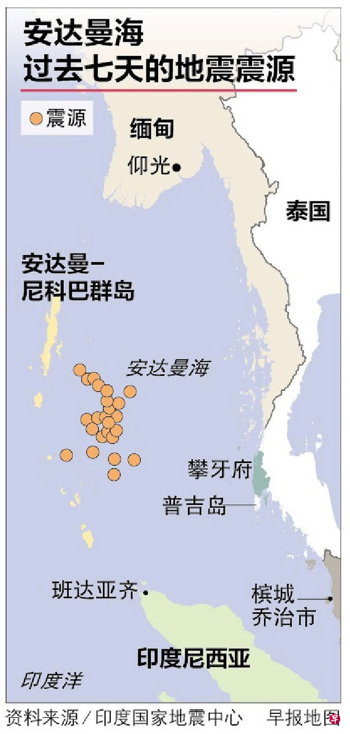 《印度斯坦时报》报道,安达曼群岛和尼科巴群岛周一和周二发生25次地震,强度介于3.8级至5级。印度国家地震中心指出,这些地震的震中分布于西安达曼断层及安达曼扩张脊之间,“当前的地震活动并非不寻常”,以前也曾有过。