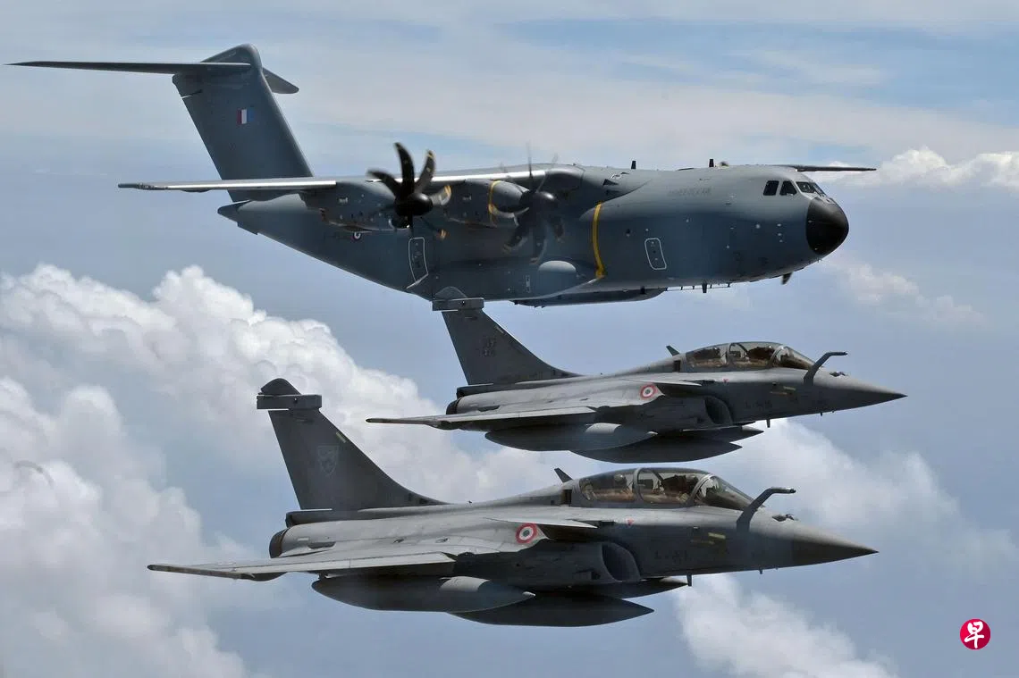 法国的达索阵风(Dassault Rafale)多用途战斗机和A400M军用运输机星期一(9月12日)在印度尼西亚的巽他海峡(Sunda Strait)上空进行飞行示范。为了更新现役战斗机,印尼原本在2018年与俄罗斯签署协议,斥资11亿美元(约15亿3600万新元)采购俄战机。但印尼去年底却以“预算考量”为由,放弃与俄罗斯的军购。今年2月,印尼转向法国和美国采购军备,包括向法国购买42架总值81亿美元的阵风战斗机。(法新社)