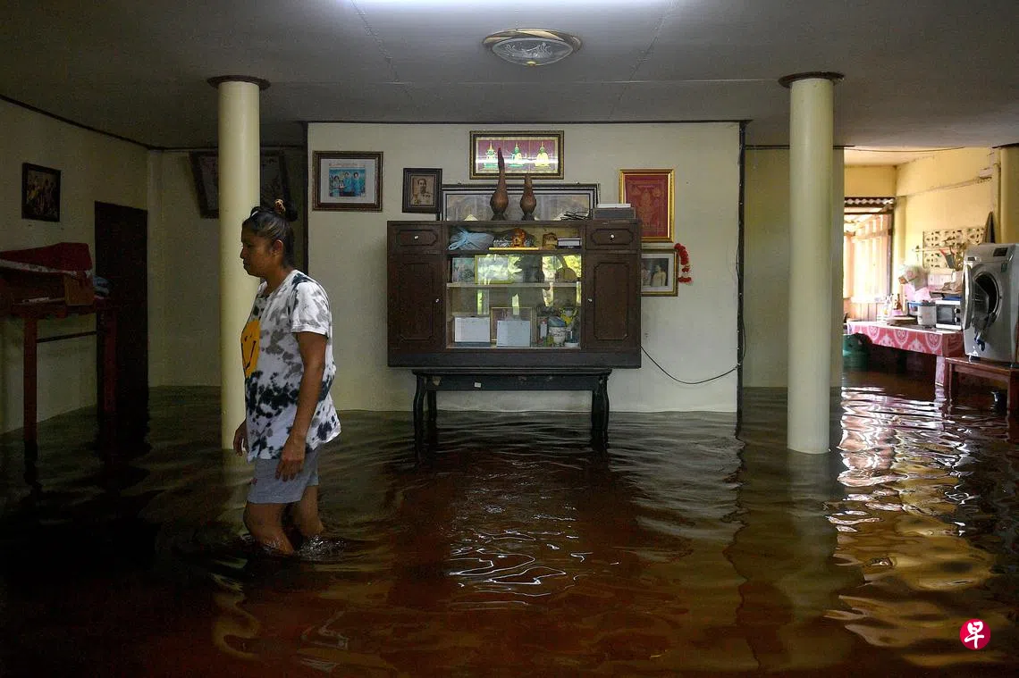 泰国许多地区近日受豪雨后洪水泛滥的灾情困扰,图中这名妇女位于大城府(Ayutthaya)的住家,到了13日还依然浸泡在浑浊的污水中,水位及膝,让她无奈也有苦难言。