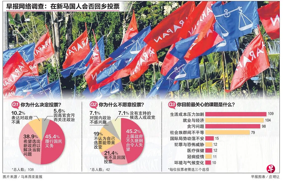 调查结果显示,71.1%(108人)的受访者愿意回国投票或邮寄选票。其中,45.4%是为了履行国民义务而投票,另有接近四成则希望选出新政府,以更好地解决马国当前面对的社会和经济问题。
