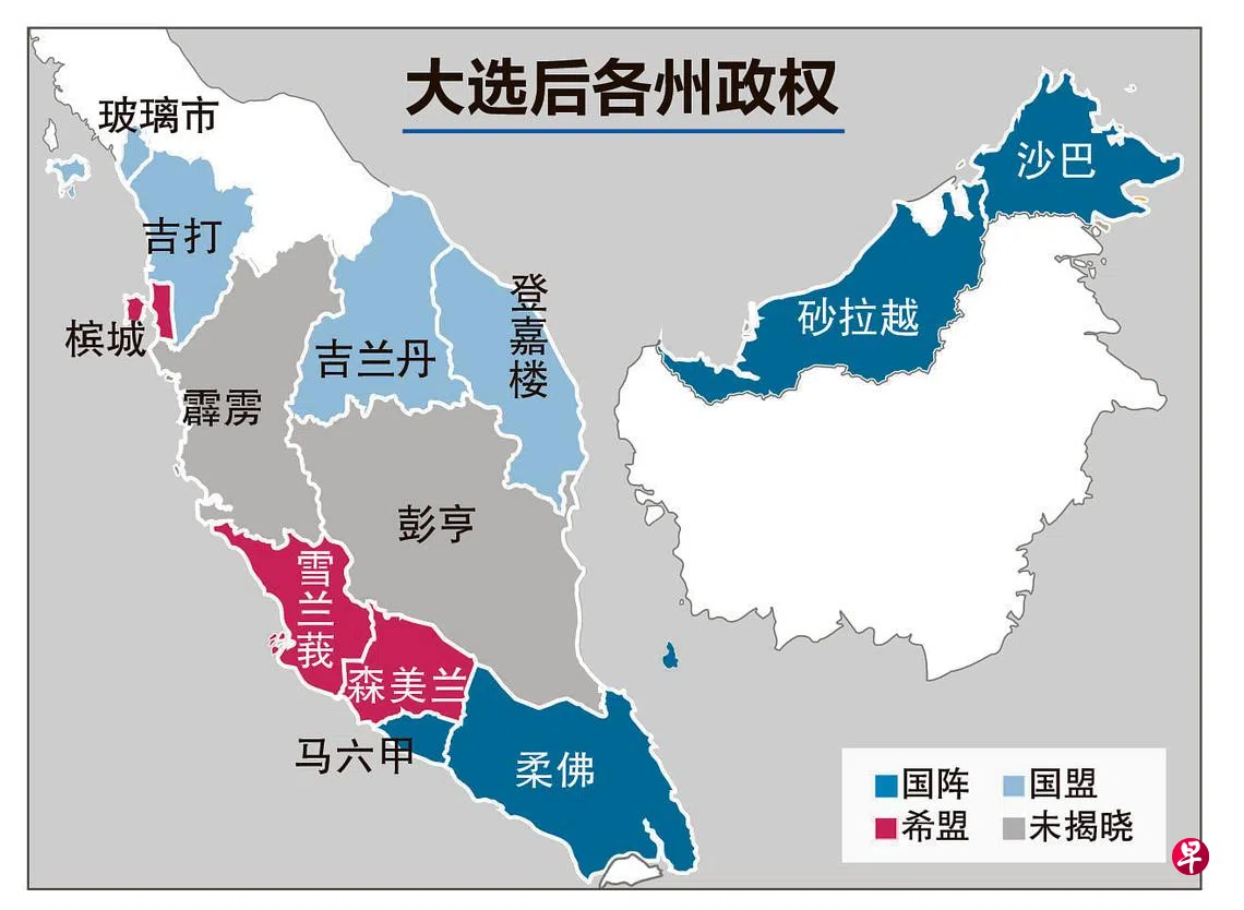霹雳和玻璃市州政权料重新洗牌,国民阵线相信只能保住彭亨州。霹州由国民联盟占据优势,恐重现悬峙议会,国盟也成功掀起“穆斯林大团结”旋风,让玻州首次实现“变天”,把半岛东海岸的势力进一步扩张。