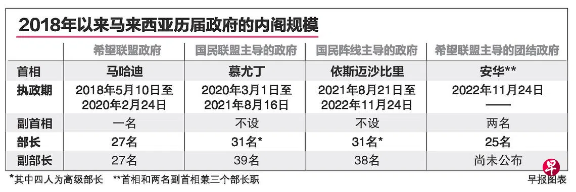 对比马来西亚过往三届政府内阁,前首相慕尤丁和依斯迈沙比里的内阁阵容最“臃肿”。