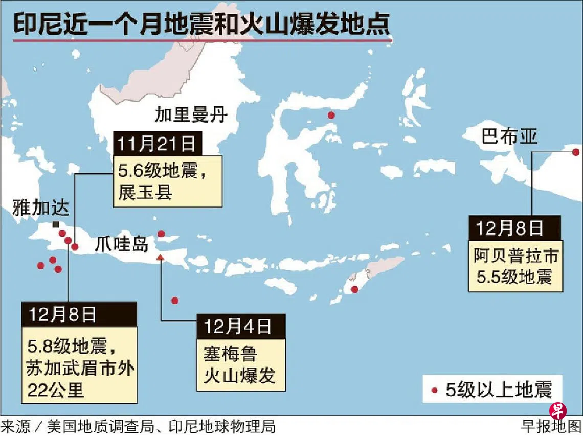 印尼多地近几周接连出现地动山摇。其中,11月21日西爪哇展玉县(Cianjur)发生5.6级地震,死亡人数超过300人;两天后,东爪哇庞越市(Probolinggo)也发生4.1级地震。