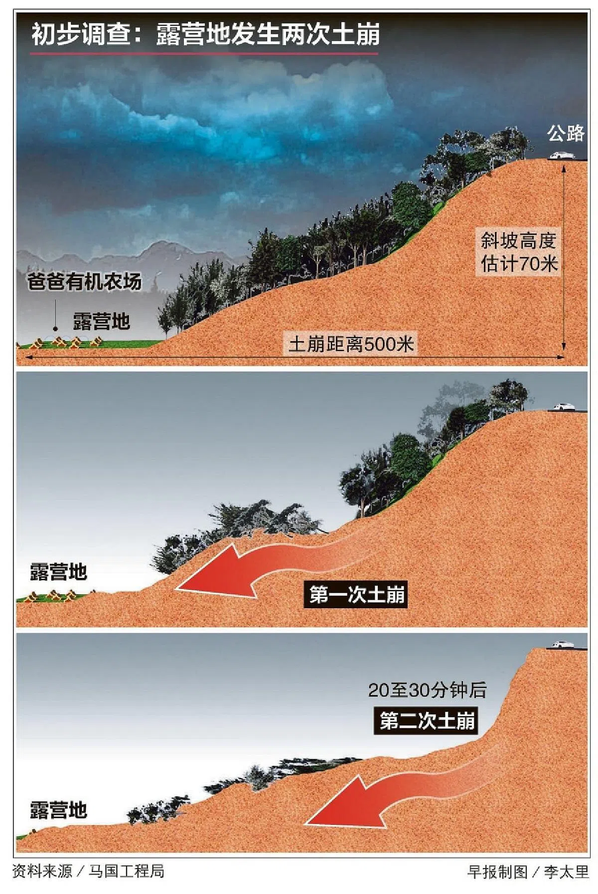 马国工程局星期天(12月18日)发文告指出,峇冬加里“爸爸有机农场”露营地附近的边坡星期五(12月16日)凌晨连续发生了两次土崩。“第一次边坡崩塌极可能发生在露营区,这使得边坡道路一带的土地变软,造成第二次更大的崩塌。”