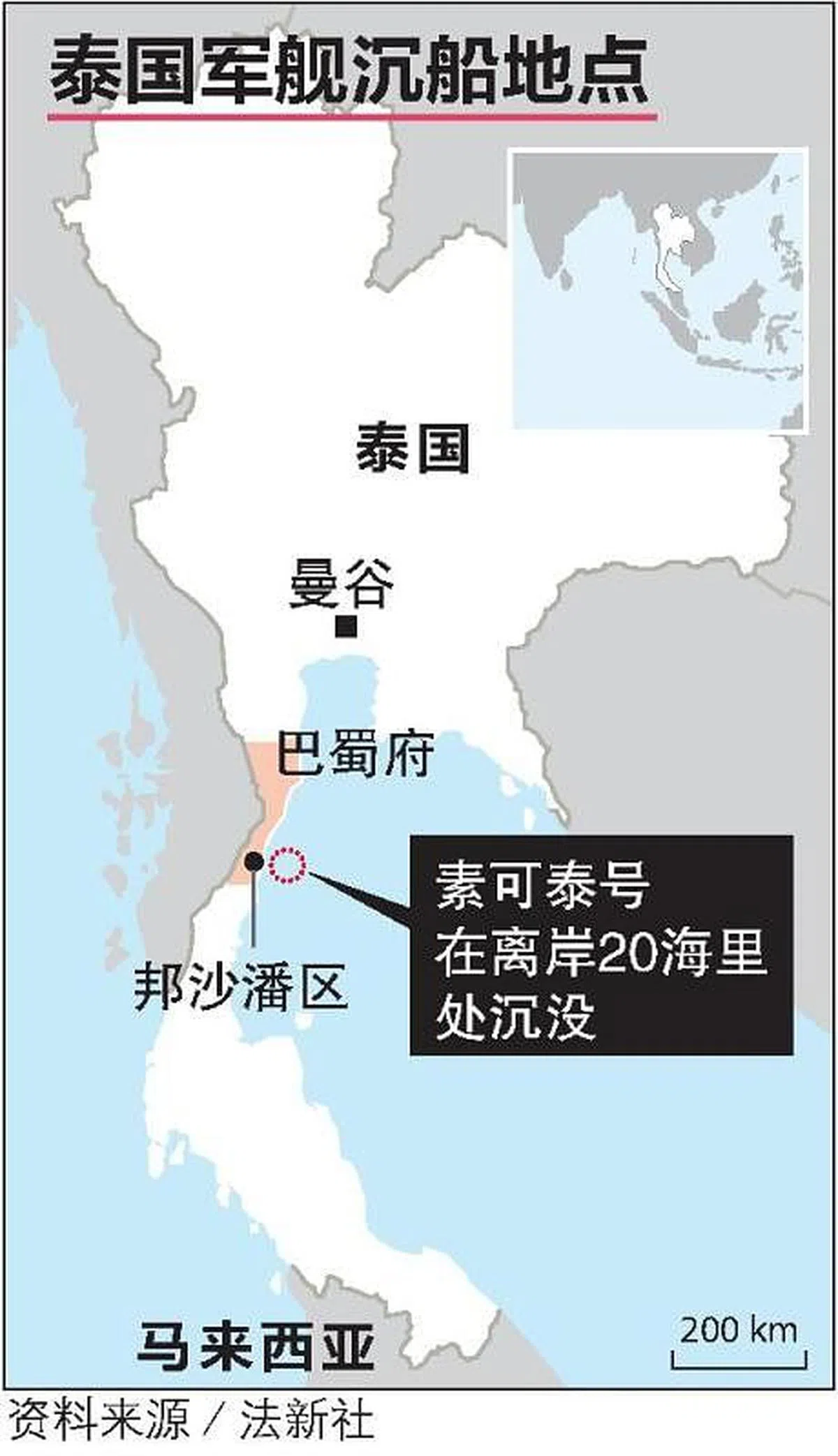 据《曼谷邮报》报道,泰国海军发言人波克戎说,当地时间星期天(12月18日)晚上11时30分左右,正在执行巡弋任务的小型护卫舰素可泰号在巴蜀府岸外20海里的海域沉没。