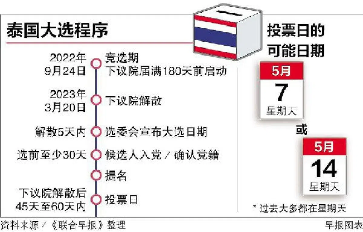 根据泰国法律,大选必须在国会解散后45天至60天内举行,这意味着投票日会落在5月4日至19日之间。泰国选举委员会早前已初步将投票日定在5月7日,但最终是哪一天将在国会解散后的五天内确定。由于泰国过去大选日多在星期天,因此这回很可能在5月14日。