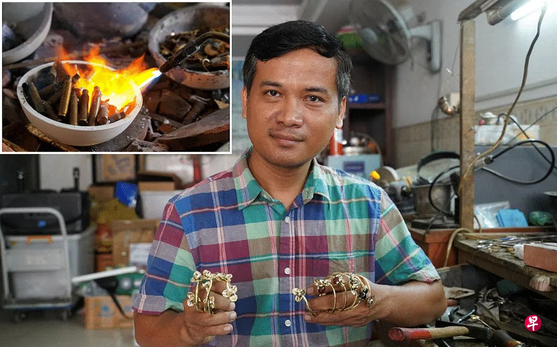 42岁的托恩(Thoeun Chantha)在金边经营首饰制作坊已超过20年。每个星期,他都会将约五公斤的AK-47和M-16子弹壳加工制成各式各样的首饰。