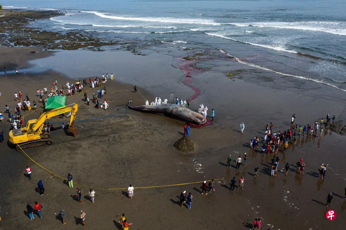 这头17米长的雄性抹香鲸星期六(4月8日)下午被发现搁浅在峇厘岛西部珍布拉娜(Jembrana)县的海滩。